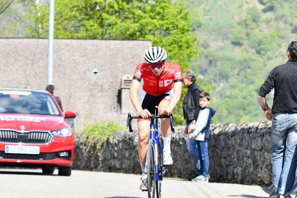 « 53 km de plaine étaient au programme avant le premier col, celui de Marie Blanque. Sur cette première partie je suis resté vigilant et je surveillais les coups qui partaient. Au km 38 environs je me retrouve devant dans un groupe de 11. Je passe sans trop en faire. On arrive au pied de Marie Blanque avec 2 min d’avance et au bout de 500m on se retrouve à 5 puis à 4 dans l’échappée. Je me sentais hyper bien à ce moment là. On passe le sommet du col. Honnêtement à ce moment là je pensais à ce moment à la gagne. Tout se passe bien on collabore puis arrivé à 35km de l’arrivée, je commence à avoir des coliques. A ce moment là je commençais à être moyen puis on arrive ds le second col. Je monte à mon rythme pour éviter les accouts. On se retrouve au sommet a 5 car 2 mecs étaient rentrés. La descente se fait puis arrivé en bas malade comme un chien. Je pensais aux sélections des prochaines échéances de juin et juillet ce qui m’a permis de continuer. J’étais crampé sur mon vélo. Ducoup j’me suis pas arrêté et je me fais rattraper je parviens quand même à prendre une 7ème place »
