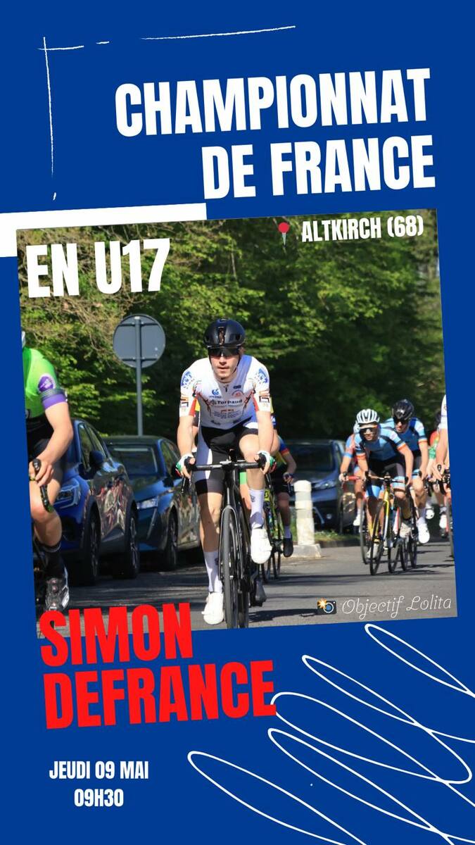 « Cette année, les championnats de France de l’avenir ce déroulaient en Alsace, à Altkirch plus précisément. Un circuit qui comptait 3 bosses assez dur, avec pour deux d’entres elles un vent défavorable. Le peloton a roulé très vite car malgré des côtes, nous avons eux une vitesse moyenne de 40 km/h. Cela a fait que le placement était important surtout sur la partie du circuit où c’était en ville avec des routes étroites, j’ai pas eu le résultat espéré sûrement du à des efforts répété pendant la course du à des mauvais placements par moments. J’arrive à finir 15eme , je me sens bien pour la suite de la saison. »