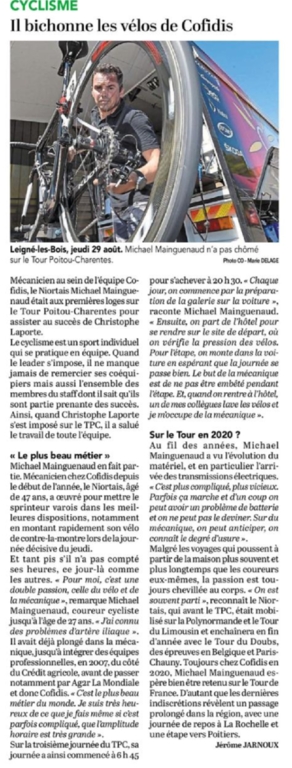 Article du Courrier de l'Ouest le 14/09/19 sur MAINGUENAUD Mickaël qui était licencié au club. Mickaël a continué de rester dans le cyclisme comme Mécanicien dans les équipes professionnel. Il a été mécanicien dans plusieurs équipes professionnel, et cette année, il est dans l'équipe COFIDIS.