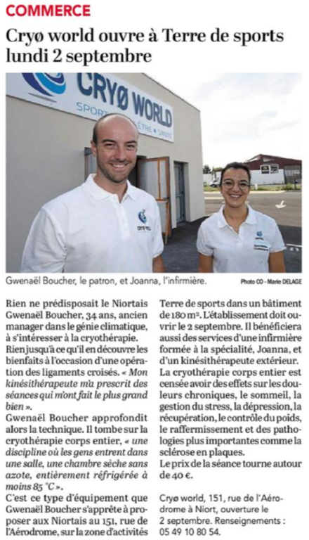 Article du Courrier de l'Ouest sur un de nos licencié BOUCHER Gwenaël qui vient de lancer son entreprise CRYO WORLD aujourd'hui à NIORT.