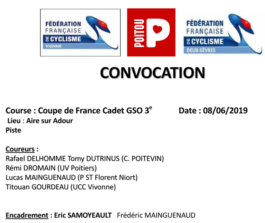 L'équipe du Team Poitou Cadets pour la Coupe de France GSO à AIRE SUR ADOUR sur la piste le 08/05/19 avec la présence de MAINGUENAUD Lucas de la PSF NIORT.