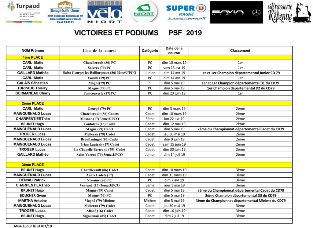 Les victoires et les podiums de nos coureurs du club de la PSF NIORT en FFC sur route depuis le début de saison mis à jour le 31/07/19.