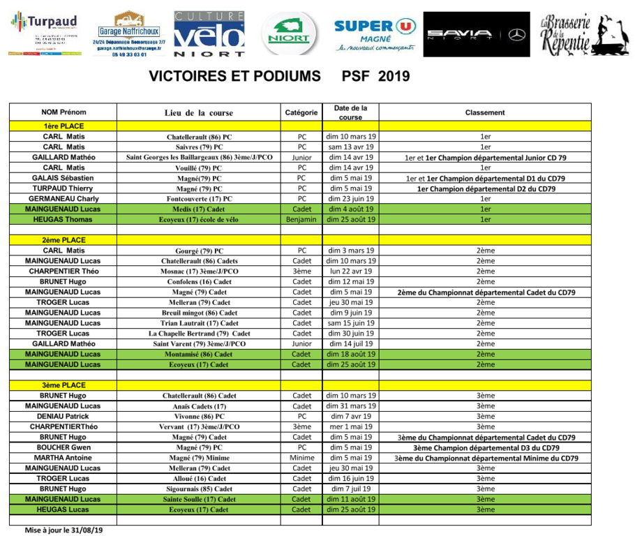 Les victoires et les podiums de nos coureurs du club de la PSF NIORT en FFC sur route depuis le début de saison mis à jour le 31/08/19.