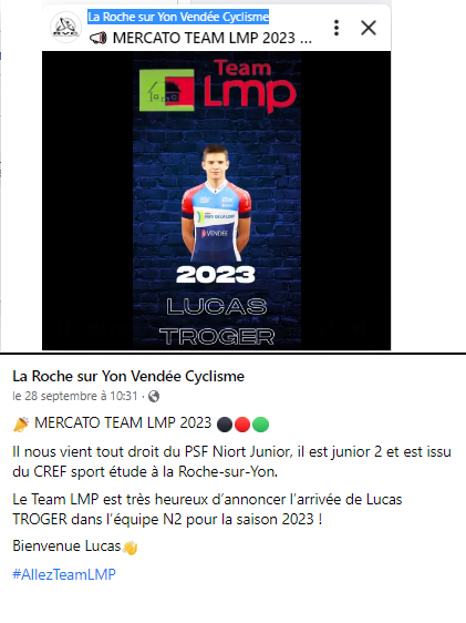 Après l’annonce il y a quelques jours du départ de Lucas Mainguenaud, la PSF Niort est fière de vous annoncer, à nouveau, le départ d’un de ses jeunes présent au club depuis l’école de vélo, vers l’une des meilleurs équipes amateurs en France