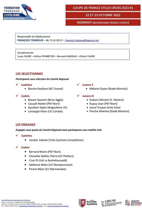 Joan Dupuy (Junior) et Mattéi Cacault (Cadet) seront présents ce week-end à Nommay pour la 1ère manche de la Coupe de France de cyclo-cross avec le comité Nouvelle-Aquitaine